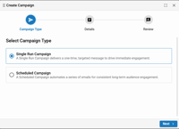 Select whether the item will be a single run campaign or a scheduled campaign. A single run will send one time, while a scheduled campaign will send on a predetermined campaign schedule.